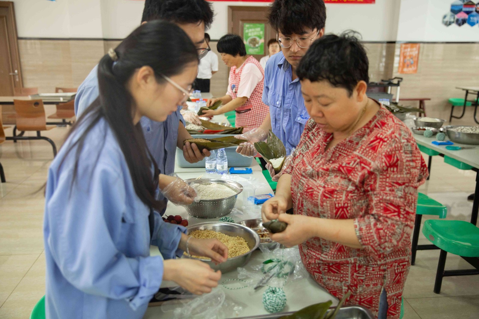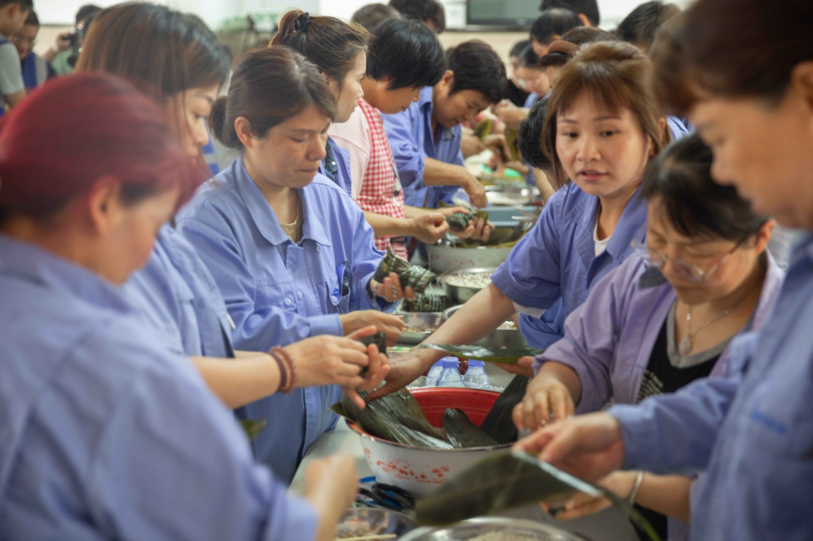 包粽子現(xiàn)場(chǎng),職工們分工默契,熟練地捋粽葉、做漏斗狀、填糯米、壓緊實(shí)、封口、扎捆,一個(gè)個(gè)有模有樣的粽子迅速成型,現(xiàn)場(chǎng)被歡樂和諧的節(jié)日氣氛包圍,其樂融融。